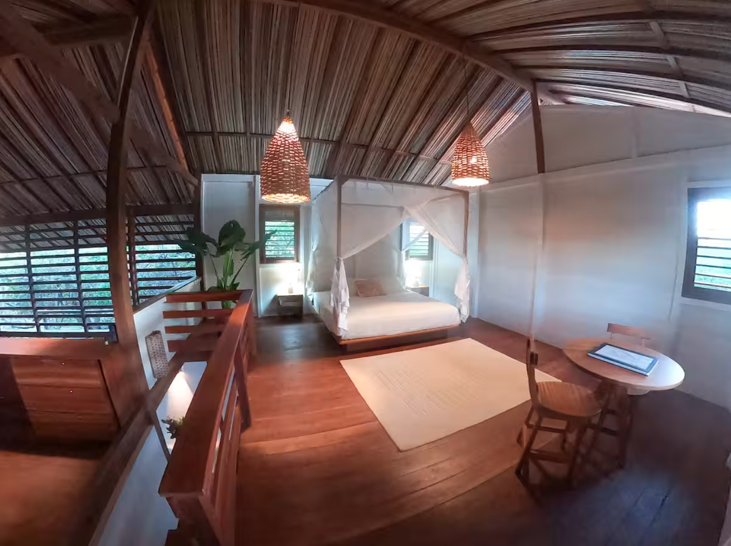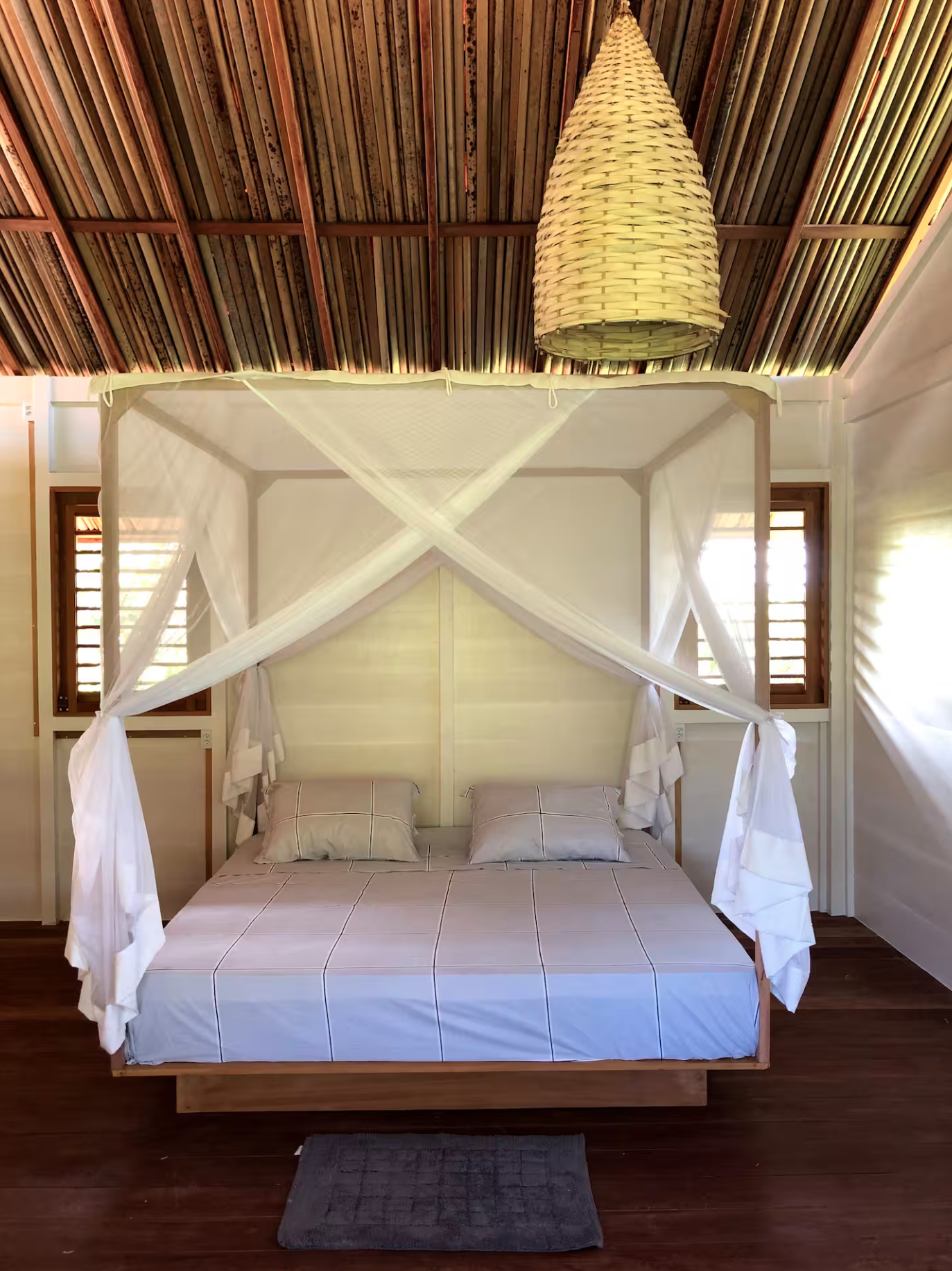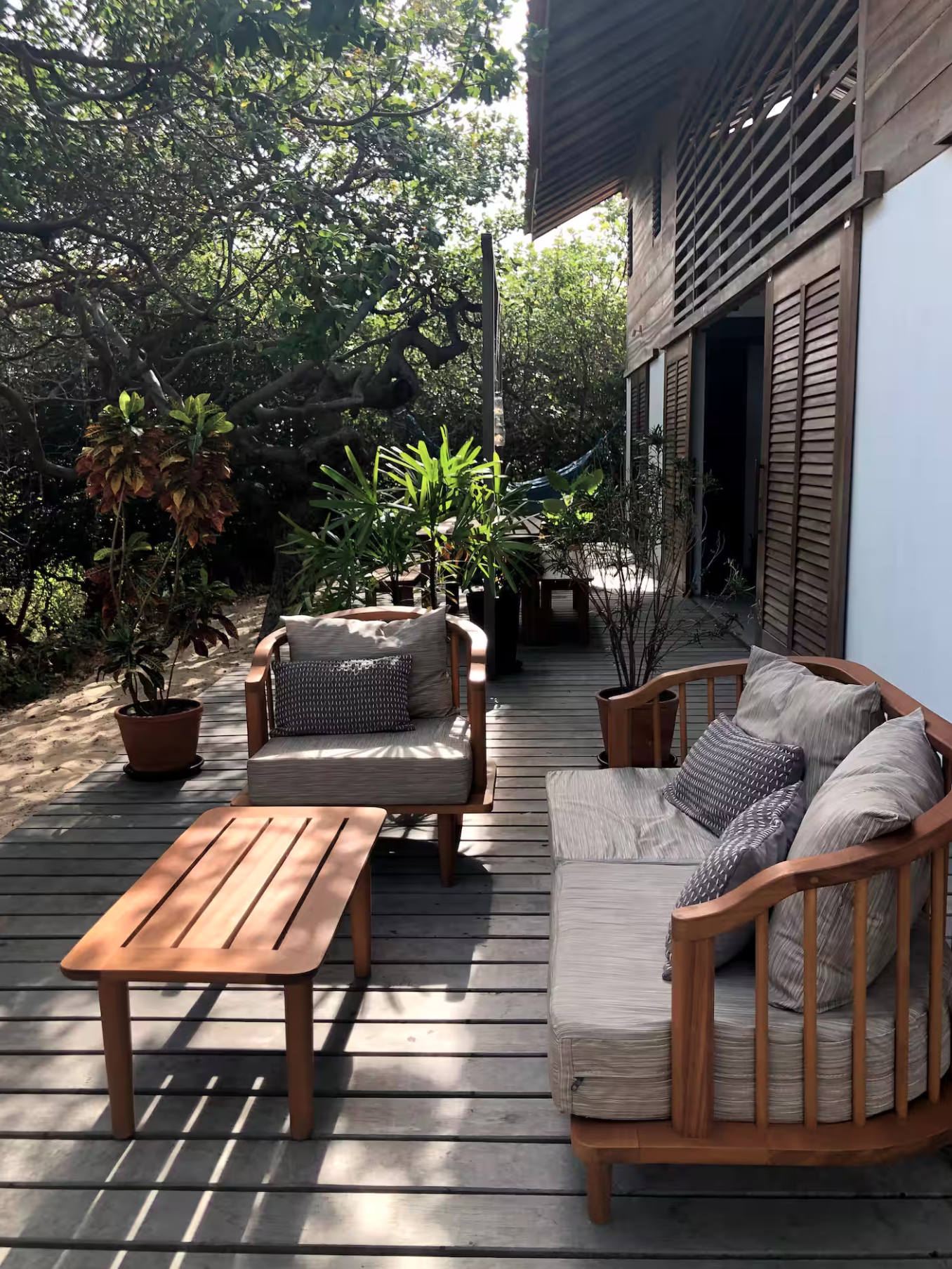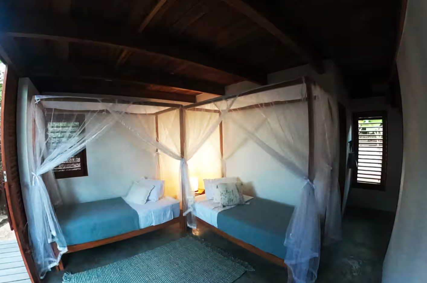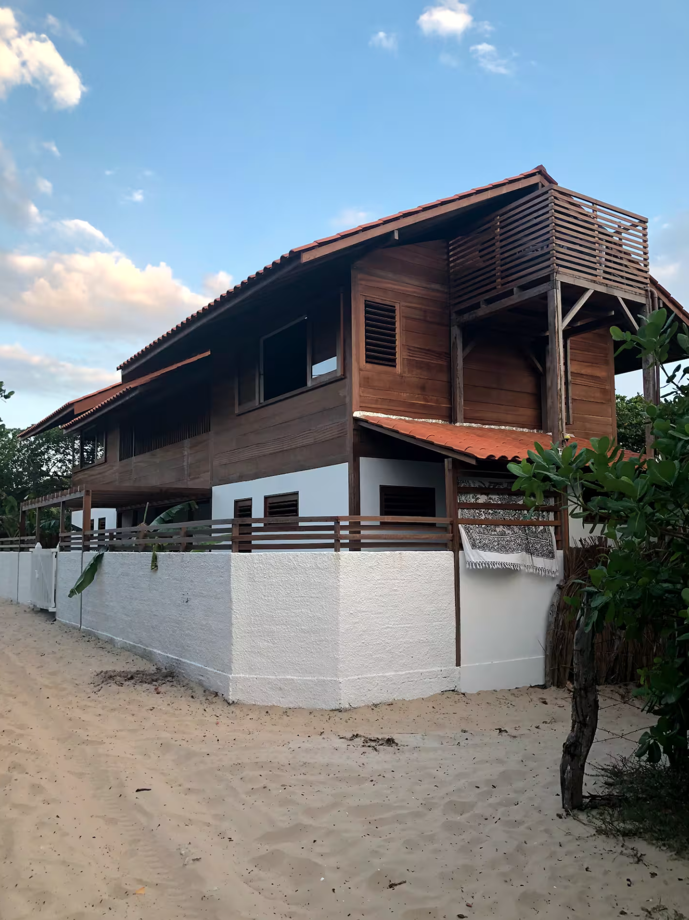A sustainable wooden lodge in the center of Atins. Designed for natural airflow, with bio-digesters and composting systems. Daily housekeeping included. Upstairs, a mezzanine workspace looks out toward the palms. Ten minutes on foot — or four by ATV — brings you to the beach.