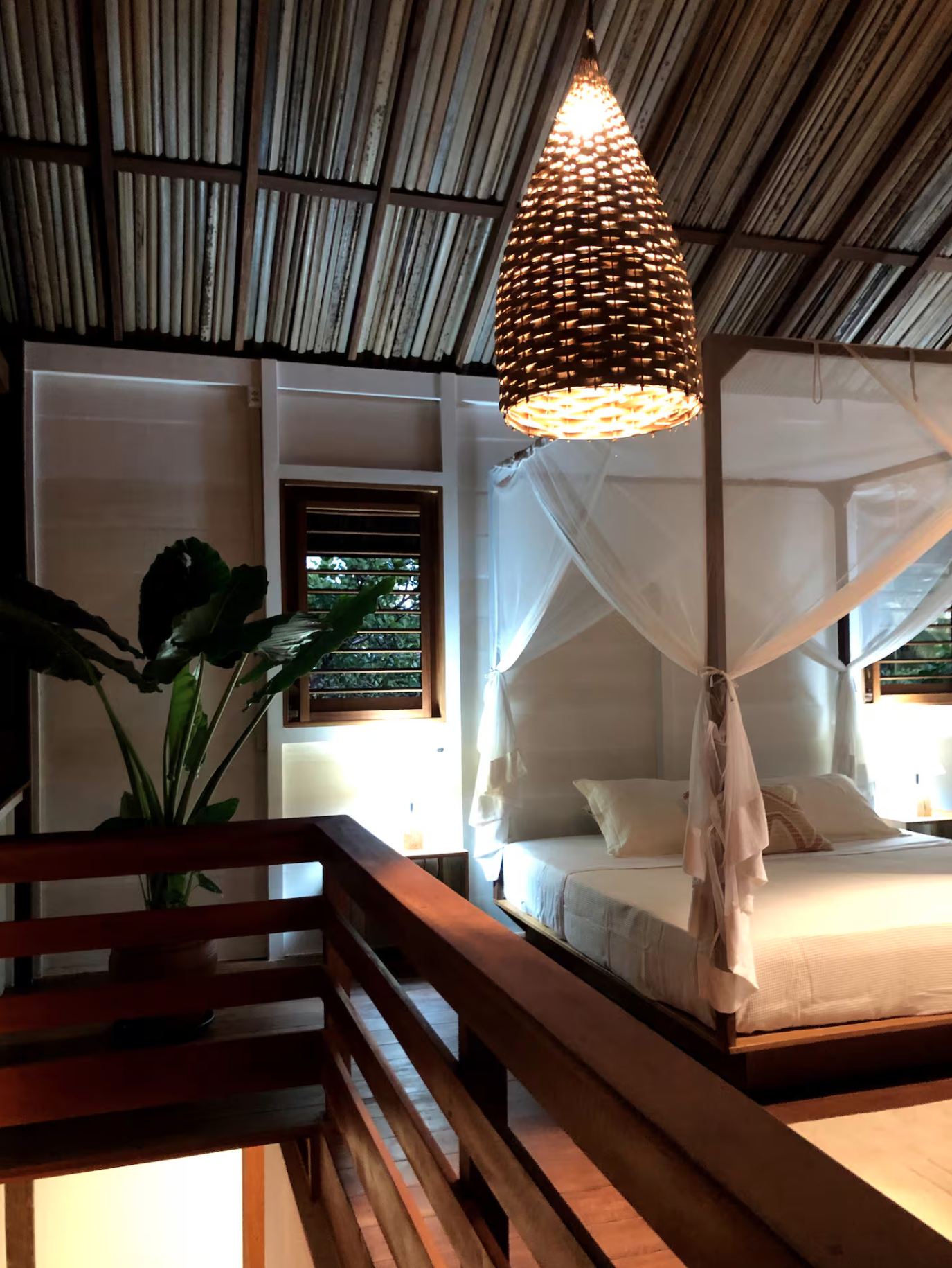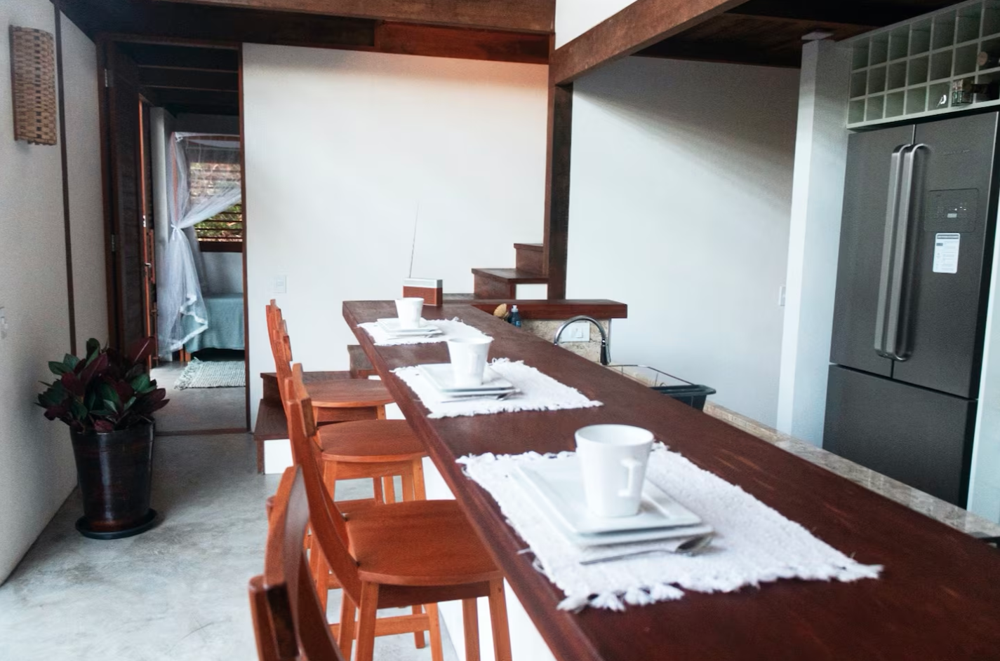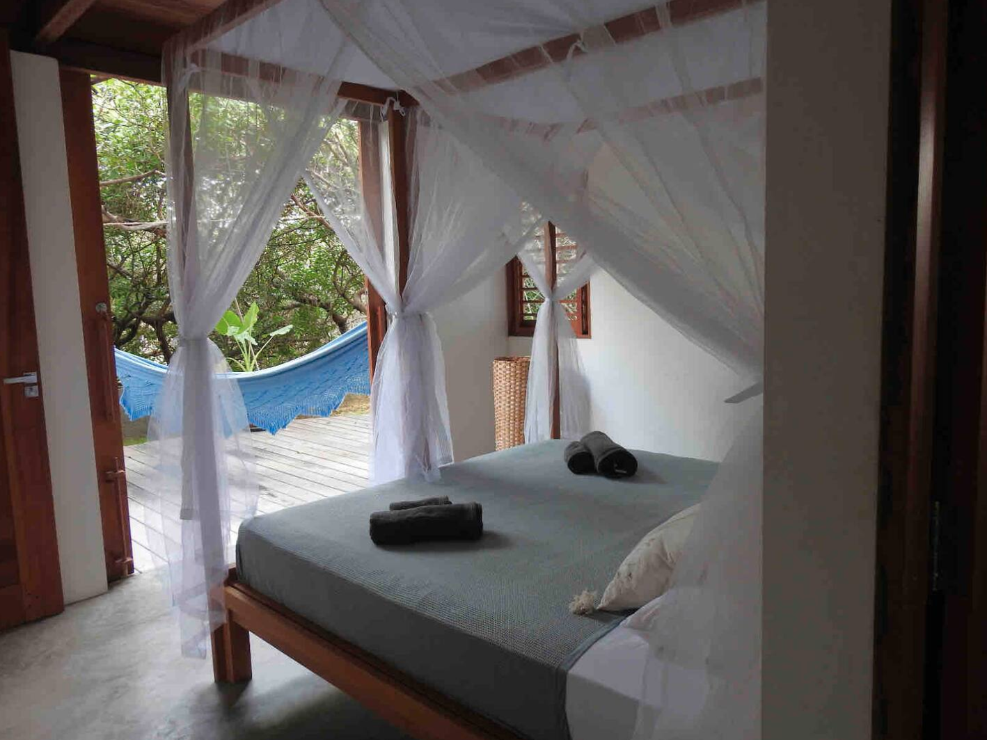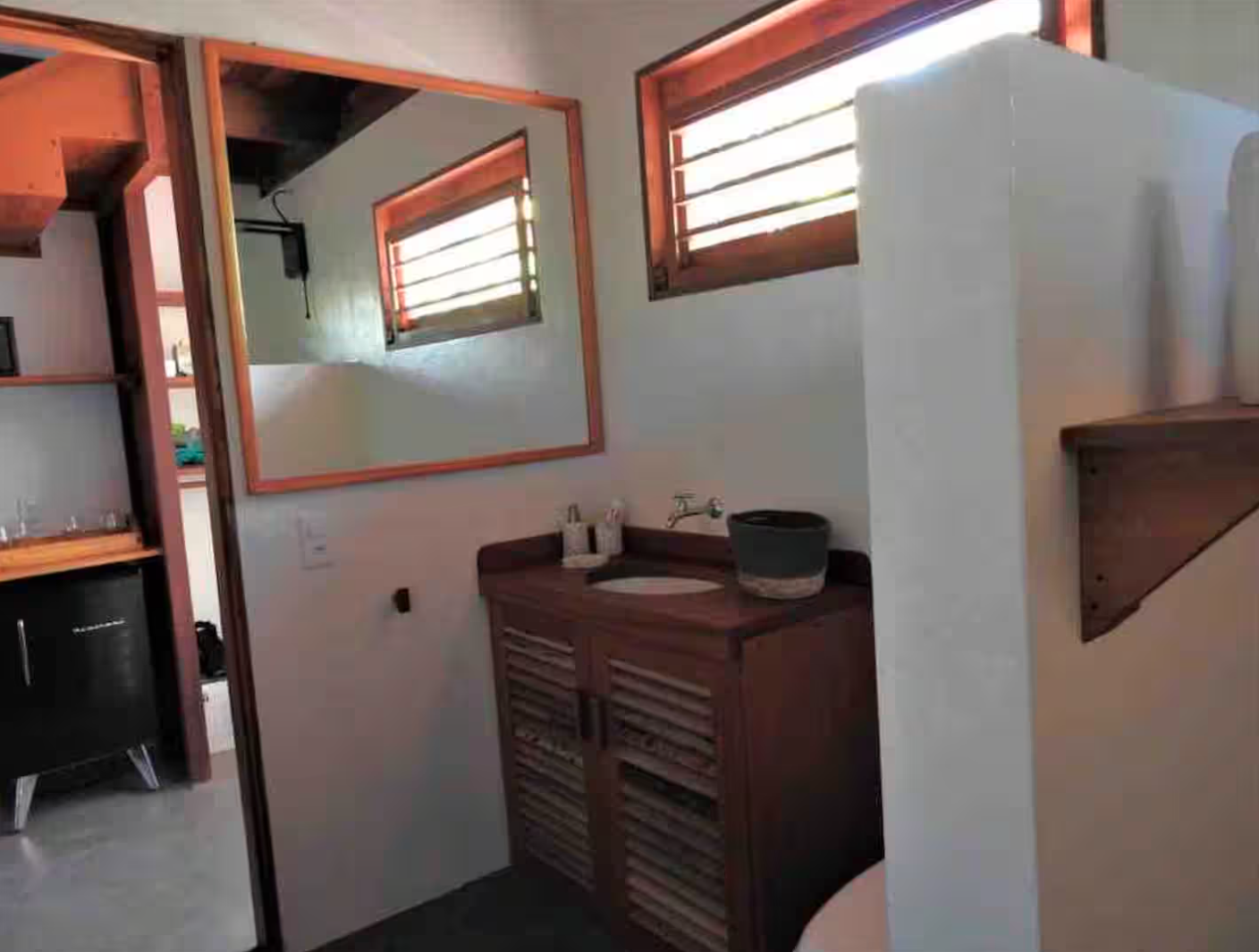 A sustainable wooden lodge in the center of Atins. Designed for natural airflow, with bio-digesters and composting systems. Daily housekeeping included. Upstairs, a mezzanine workspace looks out toward the palms. Ten minutes on foot — or four by ATV — brings you to the beach.