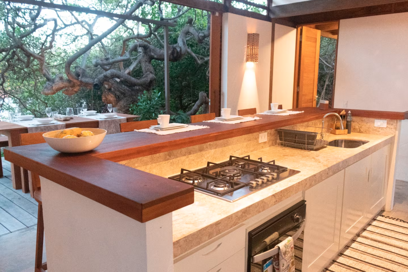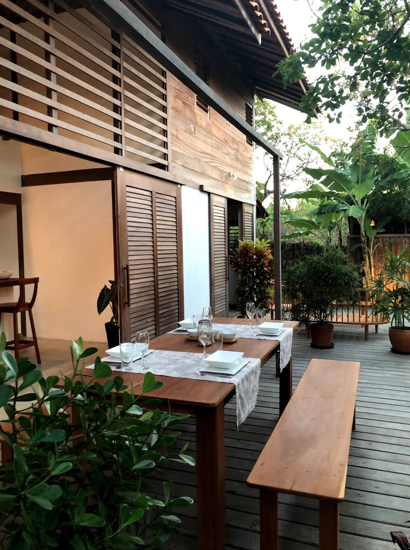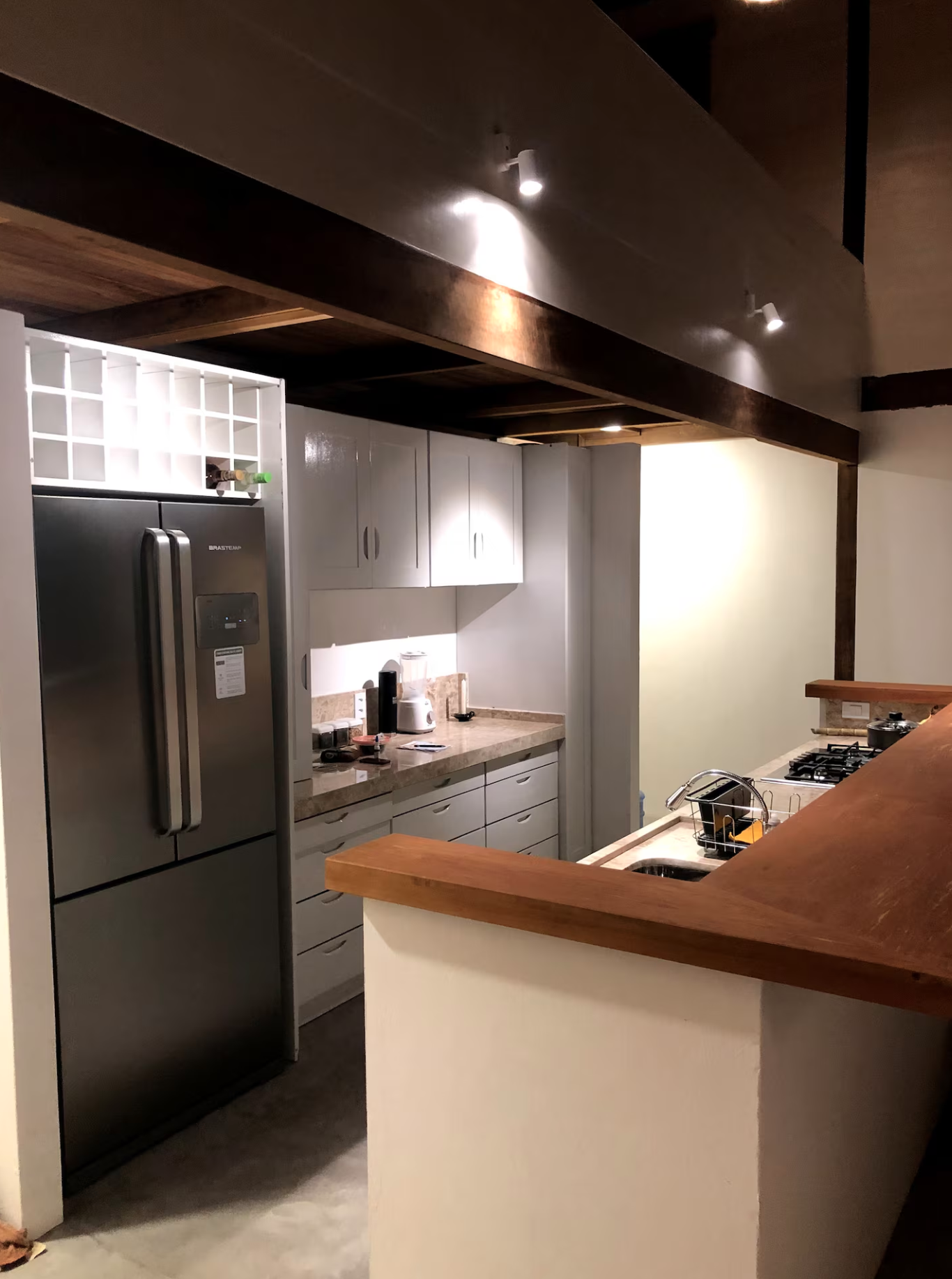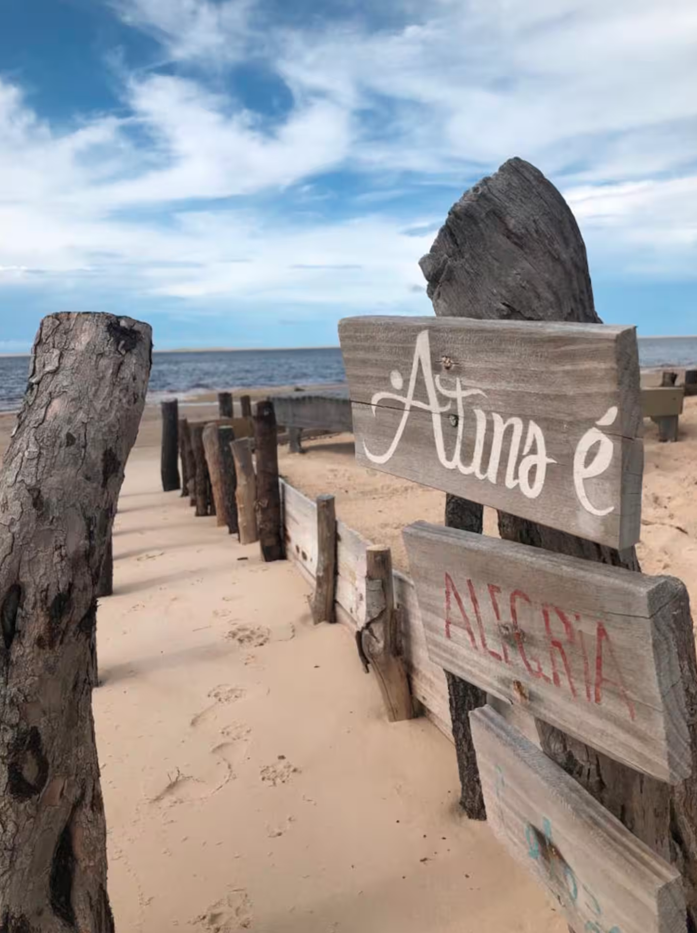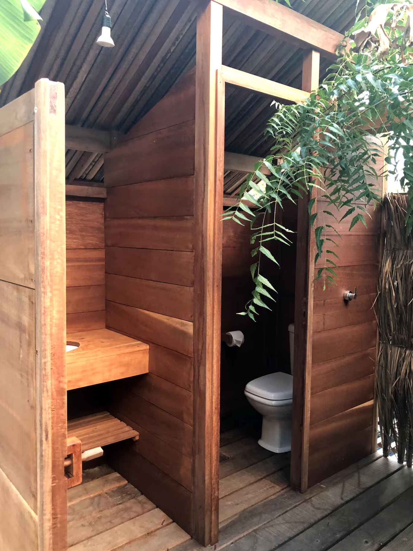 A sustainable wooden lodge in the center of Atins. Designed for natural airflow, with bio-digesters and composting systems. Daily housekeeping included. Upstairs, a mezzanine workspace looks out toward the palms. Ten minutes on foot — or four by ATV — brings you to the beach.